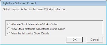 All Stock Materials records associated with the target Works Order record will be listed on the grid control. It is possible to recall and edit / delete existing allocation records by double clicking on the required record on the grid. HighStone will prompt with the options: