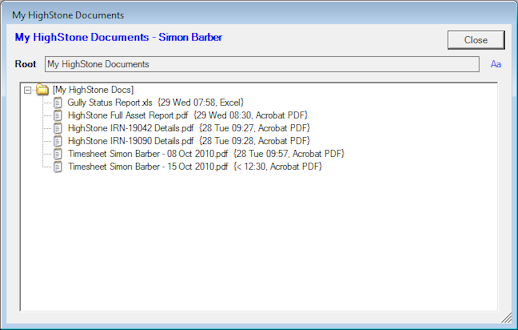 Once a Timesheet has been created in PDF format it can be recalled in printed format without the need re-create the format file again (note that a PDF Timesheet file is not automatically deleted or re-created in timesheet allocations are subsequently revised). Saved files can be found under your HighStone documents folder My HighStone Documents (under the application top Menu Branch) and can be viewed / printed from there: