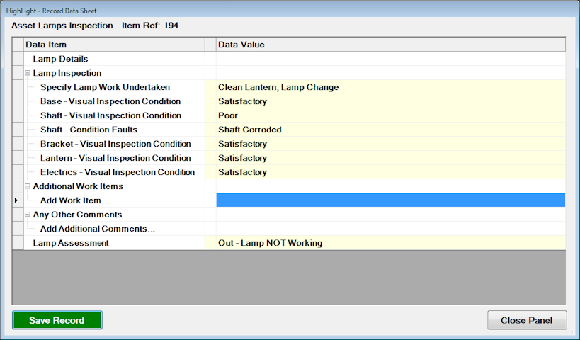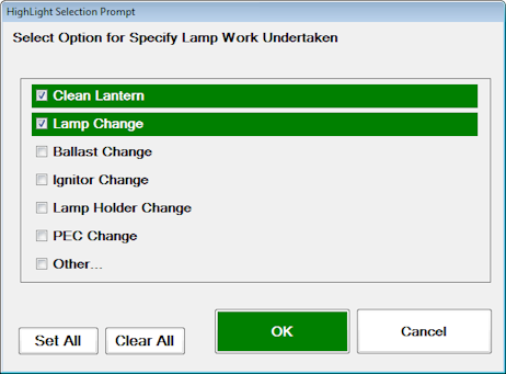 On a Walk through survey (detailed inspection), HighLight can record such details using the prompt mechanisms (pre-configured list). By selecting the first item on the prompt list - 'Specify Lamp Work Undertaken', HighLight will take the user throough a series of prompt options to record information regarding the asset.