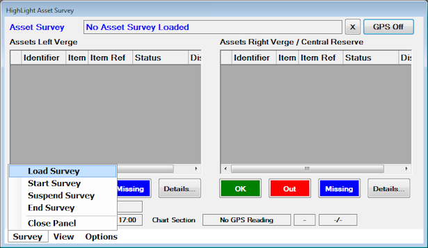This opens the survey showing lamp assets on the left and right fields of the display corresponding to the Left verge and right central reservation.