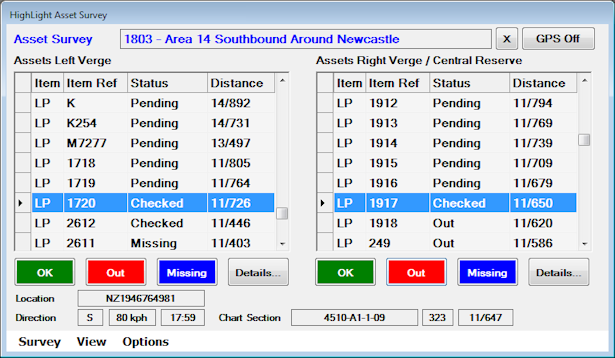 To begin the survey, select 'Start Survey' from the Survey Menu Item. The survey will begin scrolling from the bottom up (previous selection option), checking off the lamps as the drive through is progressed. The default is OK, however at any point, left or right lamp assets can be tagged with 'Out' or 'Missing' as shown below.