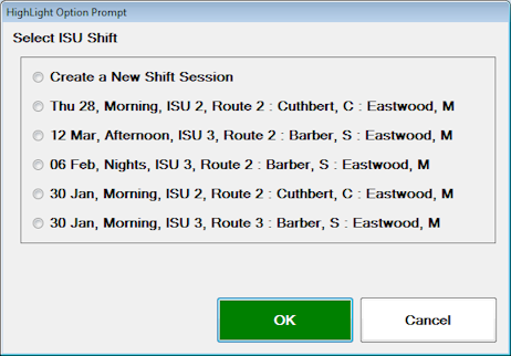 Having connected to a local database on the device a New Shift Session can be raised or an existing Shift Session can be selected. In many situations the ISU Shift Rota will be uploaded to the mobile device and refreshed on a regular basis (recommend weekly as minimum) with staff names, supervisors etc, however in order to meet unforeseen variables, the option to create shifts 'on the fly' is available.