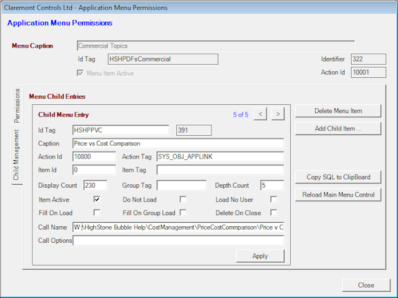 Again populate the Id Tag (i.e. HSHBPVC) and the Caption with the menu item text (i.e. Price vs Cost Comparison).
