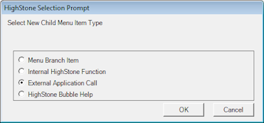Select the Add Child Item button. A prompt for the menu item type will open as below. For PDF Bubble Helps - select the External Application Call option.