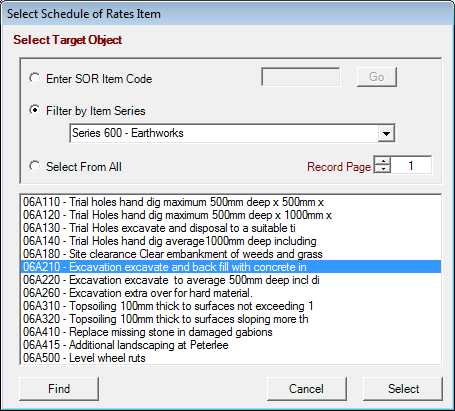 Schedule of Rates items are grouped under Sections or Series Codes. Set the radio button and select the required series from the pull-down control. The required Item record may be selected from the lower grid control list and click on Schedule of Rates items are grouped under Sections or Series Codes. Set the radio button and select the required series from the pull-down control. The required Item record may be selected from the lower grid control list and click on Select.