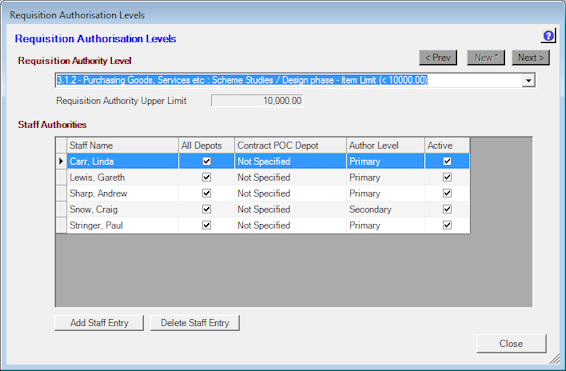 The Staff Authorities grid lists those Staff Members that are permitted to Approve Requisitions within the current Authority Level.