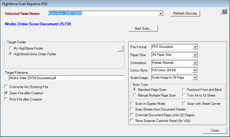 The scanning facility is only available when the Scanner is attached directly to the local computer. Scan facilities across a LAN / WAN configuration is not supported. The host Scanner must support Twain connection protocols unfortunately there is no guarantee that all Twain Compatible scanners will operate fully with HighStone.