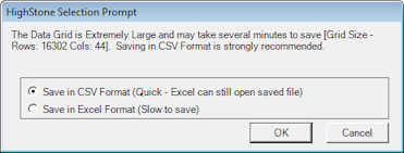 If the displayed data grid is large - over 25,000 cells - then HighStone will advise that the data is not written in .xls format (which may take a while to create), and Comma Separated Value (.csv files) format is used.