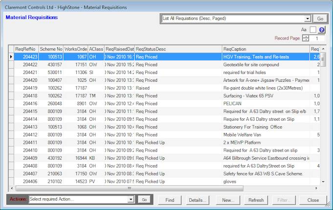 HighStone uses a standard form panel for giving Users the facility to list various types of Object Records, and from the display accessing specific details etc. The same panel definition is used for all Objects, covering Incidents, Works Orders, RMMS, Requisitions etc. There is a significant level of soft configuration that is used to control the display and operation of the panels when it is asked to display different object classes. The same panel definition is used for all Objects, covering Incidents, Works Orders, RMMS, Requisitions etc.