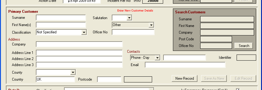 If an existing Customer record is recalled, then this record is marked as Read Only unless specifically opened for change by clicking on the Edit Record command button.  Users should remember that in this case, they are editing an existing data record that is most likely referenced from other Event Records - hence any changes committed here will also be shown against other entries using the same Customer record.