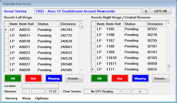 To begin the survey, select 'Start Survey' from the Survey Menu Item. The survey will begin scrolling from the bottom up (previous selection option), checking off the lamps as the drive through is progressed. The default is OK, however at any point, left or right lamp assets can be tagged with 'Out' or 'Missing' as shown below.