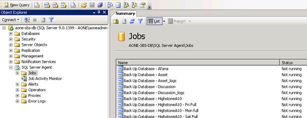 The back-ups jobs are stored in SQL Server Agent\Jobs.  Back-ups run daily (7pm) and monthly (last Friday of month) and are saved locally to G drive and sent to aone-hs-02.  A scheduled task also runs from control panel to zip the files and send them to aone-ifs-08.